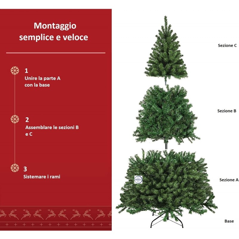 - sistema ad ombrello che rende questo albero di Natale facile da istallare. L'albero infatti è costituito da tre parti: il fondo, il centro e la parte superiore. I rami sono già fissati al tronco. Quindi, basta assemblare le sezioni, aprire, sistemare i rami e l’albero è pronto: bastano 3 minuti.