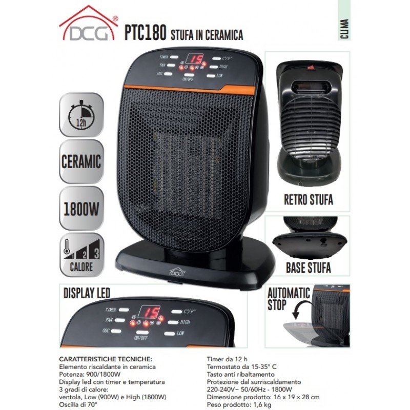 PTC180 è il termoventilatore di DCG dotato di resistenza ceramica.Specifiche della stufa DCG PTC180- Elemento riscaldante in ceramica